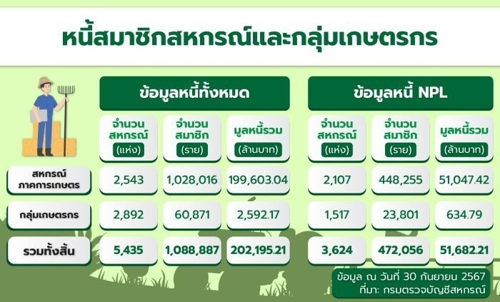 กรมส่งเสริมสหกรณ์ เพิ่มความเข้มข้นแก้ไขปัญหาหนี้สินสมาชิกสหกรณ์-กลุ่มเกษตรกรกว่า 2 แสนล้าน ตั้งคณะทำงานลงลึกระดับจังหวัด จัดทีมโค้ชร่วมปรึกษาแก้หนี้ยั่งยืน เพิ่มรายได้เสริม ควบคู่สร้างวินัยทางการเงิน ตั้งเป้าปี 2568 ลดมูลหนี้ค้างชำระไม่ต่ำกว่า 25%