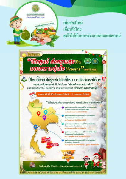 กรมส่งเสริมสหกรณ์เปิดพื้นที่ศูนย์ถ่ายทอดเทคโนโลยีการสหกรณ์เพื่อให้บริการห้องพักราคาประหยัด แก่สมาชิกสหกรณ์ กลุ่มเกษตรกร และประชาชนทั่วไป ในช่วงเทศกาลปีใหม่ จำนวน 5 แห่ง ใน 5 จังหวัดท่องเที่ยว ได้แก่ ศูนย์ถ่ายทอดเทคโนโลยีการสหกรณ์ที่ 5 อำเภอเมืองนครราชสีมา จังหวัดนครราชสีมา ศูนย์ถ่ายทอดเทคโนโลยีการสหกรณ์ที่ 7 อำเภอเมืองขอนแก่น จังหวัดขอนแก่น ศูนย์ถ่ายทอดเทคโนโลยีการสหกรณ์ที่ 9 อำเภอสันทราย จังหวัดเชียงใหม่ ศูนย์ถ่ายทอดเทคโนโลยีการสหกรณ์ที่ 11 อำเภอวังทอง จังหวัดพิษณุโลก และศูนย์ถ่ายทอดเทคโนโลยีการสหกรณ์ที่ 15 อำเภอชะอำ จังหวัดเพชรบุรี ในราคา 150 บาทต่อคนต่อคืน เปิดให้เข้าพักระหว่างวันที่ 30 ธันวาคม 2568 – 2 มกราคม 2569 เพื่อเป็นอีกหนึ่งทางเลือกในการท่องเที่ยวพักผ่อนอย่างประหยัดและอบอุ่นในช่วงเทศกาลแห่งความสุข
