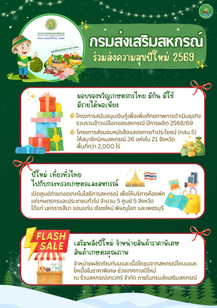 นายนิรันดร์ มูลธิดา อธิบดีกรมส่งเสริมสหกรณ์ เปิดเผยว่า กรมส่งเสริมสหกรณ์เตรียมมอบของขวัญปีใหม่ แก่เกษตรกรและสมาชิกสหกรณ์ทั่วประเทศ ผ่าน 4 โครงการสำคัญด้านการเกษตร โดยจะดำเนินการผ่านหน่วยงานในสังกัดกรมส่งเสริมสหกรณ์ทั้งส่วนกลางและส่วนภูมิภาค ซึ่งจะช่วยบรรเทาภาระค่าใช้จ่าย ยกระดับคุณภาพชีวิต และสร้างโอกาสในการพัฒนาอาชีพอย่างยั่งยืนตามนโยบายภาครัฐ อันเป็นการส่งมอบความสุขในช่วงเทศกาลปีใหม่ 2569 นี้