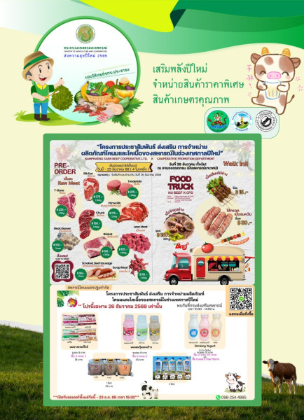 กรมส่งเสริมสหกรณ์ โดยกองพัฒนาสหกรณ์ภาคการเกษตรและกลุ่มเกษตรกร นำผลิตภัณฑ์โคนมและโคเนื้อคุณภาพจากสหกรณ์ อาทิ นมพาสเจอร์ไรส์ นมผสมวุ้นมะพร้าว โยเกิร์ตพร้อมดื่ม จากสหกรณ์โคนมนครปฐม จำกัด และผลิตภัณฑ์โคเนื้อจากสหกรณ์โคเนื้อกำแพงแสน จำกัด โดยมีไฮไลท์ คือ Food Truck KU BEEF X CPD มาจำหน่ายเนื้อโคขุนย่าง เนื้อเสียบไม้ย่าง ไส้กรอกเนื้อรมควัน และเนื้อโคคุณภาพเกรดพรีเมี่ยมในราคาพิเศษ ในวันศุกร์ที่ 26 ธันวาคม 2568 ณ กรมส่งเสริมสหกรณ์ เทเวศร์ กรุงเทพฯ