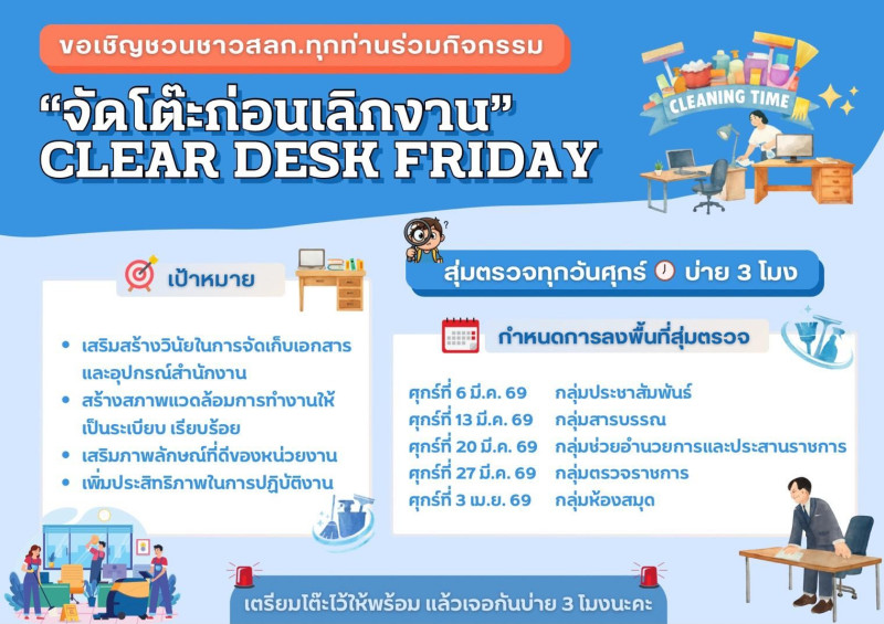 ขอเชิญชวนชาวสำนักงานเลขานุการกรมทุกท่าน เข้าร่วมกิจกรรม “จัดโต๊ะก่อนเลิกงาน” Clear Desk Friday ![]()